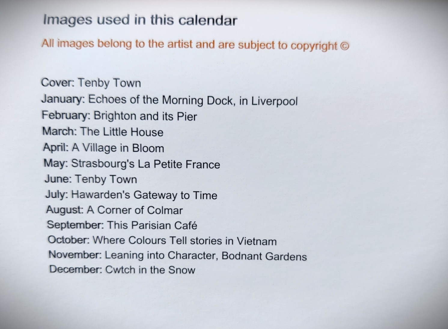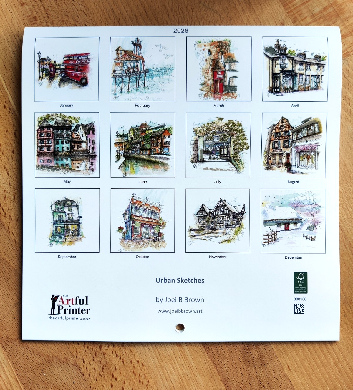 This is my calendar which is professionally printed from my original art, printed on silk cover material and 170gsm weight square silk paper for the pages. All papers are FSC certified. They are ‘stitched’ which means they are stapled at the fold and they have a hole drilled to allow them to be placed on a hook.