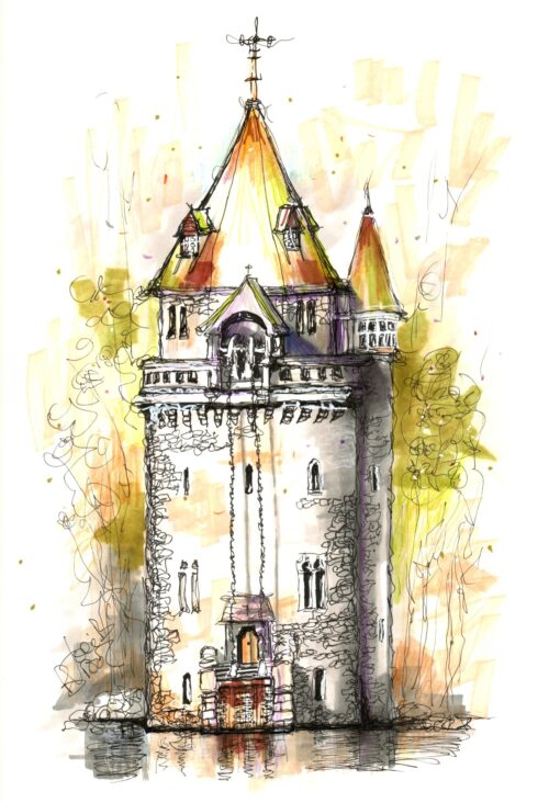 Standing tall in Lake Vyrnwy like it’s guarding a kingdom of ducks, this tower has seen majestic misty mornings, dramatic sunsets, and maybe a few confused tourists wondering if they’ve stumbled into a medieval fantasy novel. I couldn’t decide whether to go all out on this- very wonky, or traditional. I went for (mostly) traditional, you may spot a bit of intentional wonkiness!